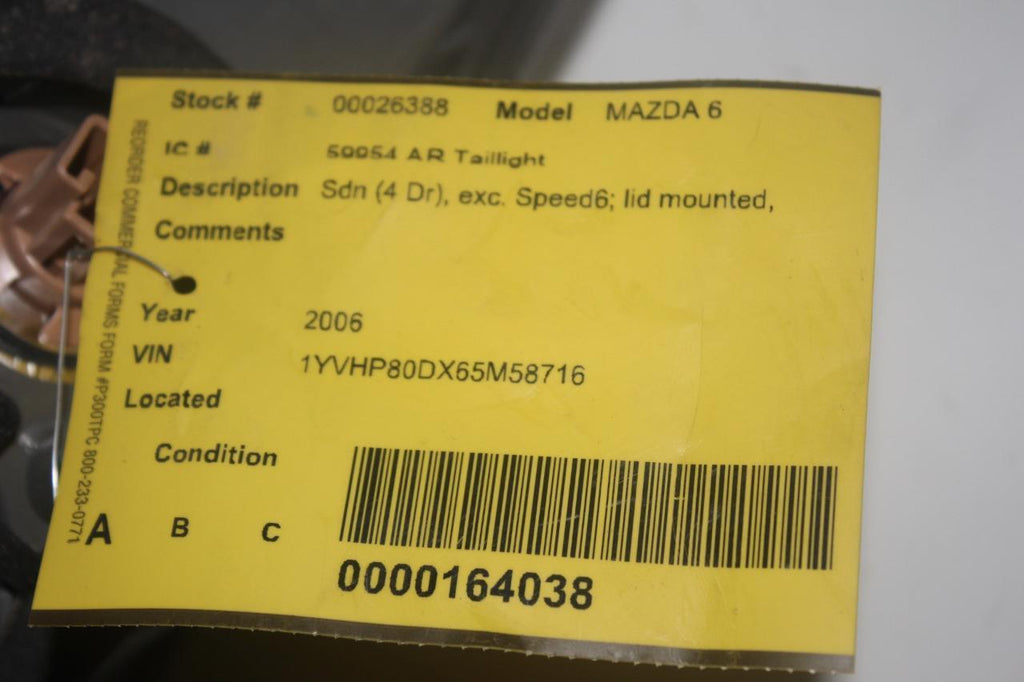 2006-2008 MAZDA 6 SEDAN PASSENGER SIDE TAIL LIGHT 26388