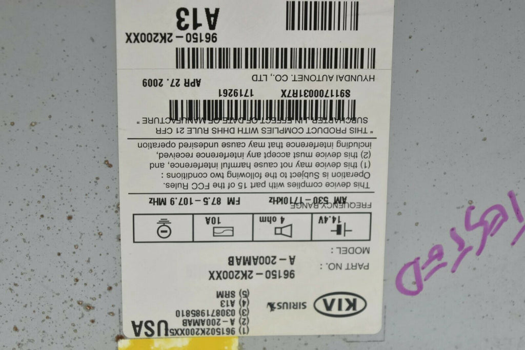 2010-2011 Kia Soul Sirius Radio Stereo Bluetooth Mp3 Cd Player 96150-2K200Xx Re#