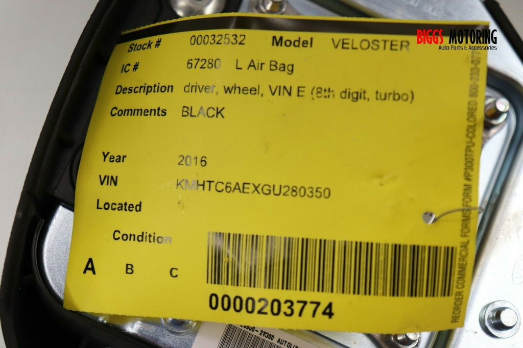 2016-2017 Hyundai Veloster Driver Side Steering Wheel Air Bag Black 32532